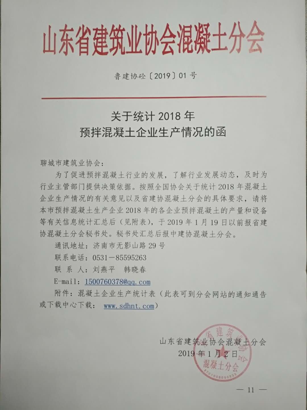 請各混凝土企業(yè)于2019年1月16日前將生產(chǎn)統(tǒng)計(jì)表發(fā)送至聊城市建筑業(yè)協(xié)會(huì)郵箱。郵箱地址:lcsjzyxh@qq.com聯(lián)系電話:8310706通知公告
